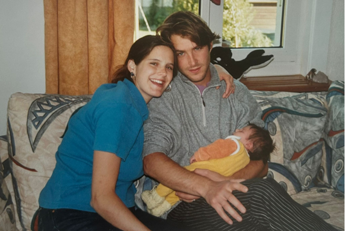 Auf dem Foto sind meine beiden Eltern mit mir im Arm zu sehen.